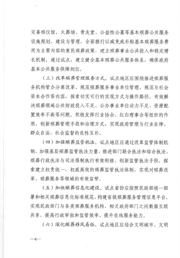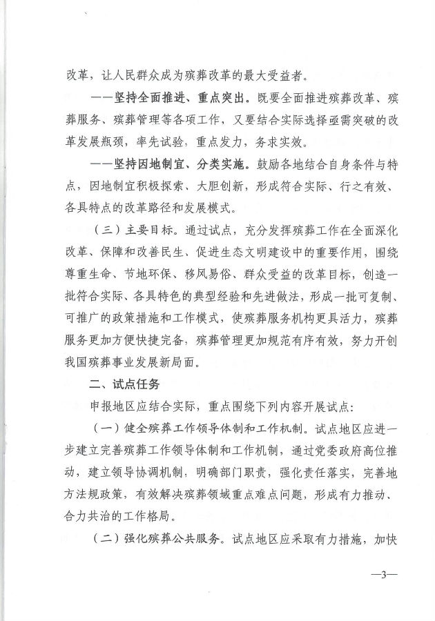 (三)主要目標。通過試點,充分發(fā)揮殯葬工作在全面深化改革、保障和改善民生、促進生態(tài)文明建設中的重要作用,圍繞尊重生命、節(jié)地環(huán)保、移風易俗、群眾受益的改革目標,創(chuàng)造一批符合實際、各具特色的典型經(jīng)驗和先進做法,形成一批可復制、可推廣的政策措施和工作模式,使殯葬服務機構更具活力,殯葬服務更加方便快捷完備,殯葬管理更加規(guī)范有序有效,努力開創(chuàng)我國殯葬事業(yè)發(fā)展新局面。