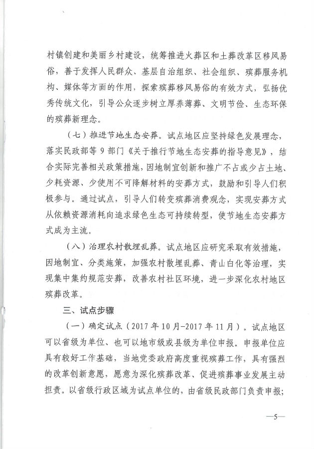 (二)制定方案(2017年12月-2018年1月)。各試點地區(qū)應根據(jù)綜合改革試點要求,制定試點方案。試點期限為2年。試點方案應針對本地區(qū)殯葬領域存在的突出問題,圍繞試點任務,細化目標任務和要求,明確責任單位和工作步驟,保障和落實試點工作經(jīng)費。試點方案經(jīng)當?shù)攸h委政府批準同意后報民政部備案。