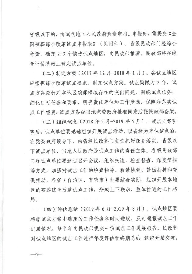 (一)確定試點(2017年10月-2017年11月)。試點地區(qū)可以省級為單位、也可以地市級或縣級為單位申報。申報單位應具有較好工作基礎,當?shù)攸h委政府高度重視殯葬工作,具有強烈的改革創(chuàng)新意愿,愿意為深化殯葬改革、促進殯葬事業(yè)發(fā)展主動擔責。以省級行政區(qū)域為試點單位的,由省級民政部門負責申報;省級以下的,由試點地區(qū)人民政府負責申報。申報時,需提交《全國殯葬綜合改革試點申報表》(見附件)。省級民政部門經(jīng)綜合考量,確定2-3個候選試點地區(qū),向民政部推薦。民政部將在綜合評估基礎上確定試點單位。