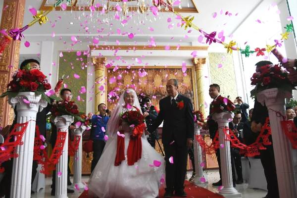 22日,在大慶天堂墓園的接待大廳,一場特別的婚禮正在舉行,90歲的彭海春牽著82歲的李桂芹走入紅毯的一瞬間,一切都是有意義的存在。